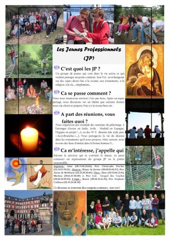 Suivant la paroisse qui te convient le mieux, tu peux contacter un représentant du groupe JP ou le prêtre responsable :
